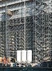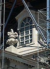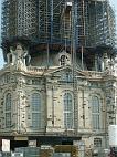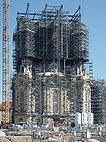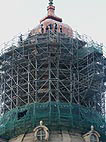 Die letzten Außenarbeiten sind bald fertig. Unten wird bereits vor der Kirche die Dachhaube montiert, welche im Juli aufgesetzt wird. Das Gerüst oben wird bald der Vergangenheit angehören. |
